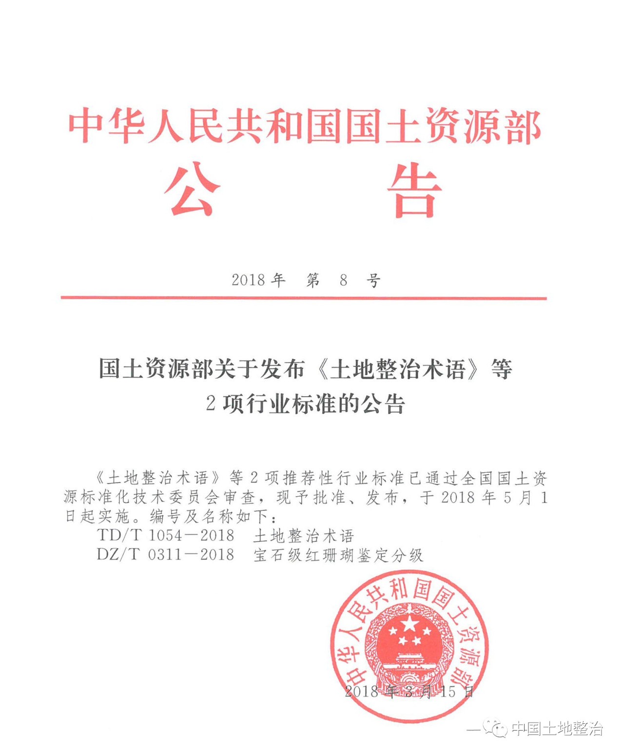 2018年3月15日,國(guó)土資源部印發(fā)2018年第8號(hào)公報(bào),批準(zhǔn)、發(fā)布《土地整治術(shù)語(yǔ)》(TD/T 1054-2018)行業(yè)標(biāo)準(zhǔn),于2018年5月1日起實(shí)施。這是繼“土地整治工程技術(shù)人員”納入國(guó)家職業(yè)分類大典(2015年,GBM20237L)、“土地整治工程”專業(yè)納入教育部本科專業(yè)目錄(2016年,082306T)、“土地整治服務(wù)”納入國(guó)民經(jīng)濟(jì)行業(yè)分類新國(guó)標(biāo)(GB/T 4754-2017,N-79-791),土地整治行業(yè)又一件具有里程碑意義的重大事件,標(biāo)志著土地整治技術(shù)體系和業(yè)務(wù)體系進(jìn)一步建立健全,土地整治學(xué)科建設(shè)和業(yè)務(wù)建設(shè)取得了關(guān)鍵性突破。